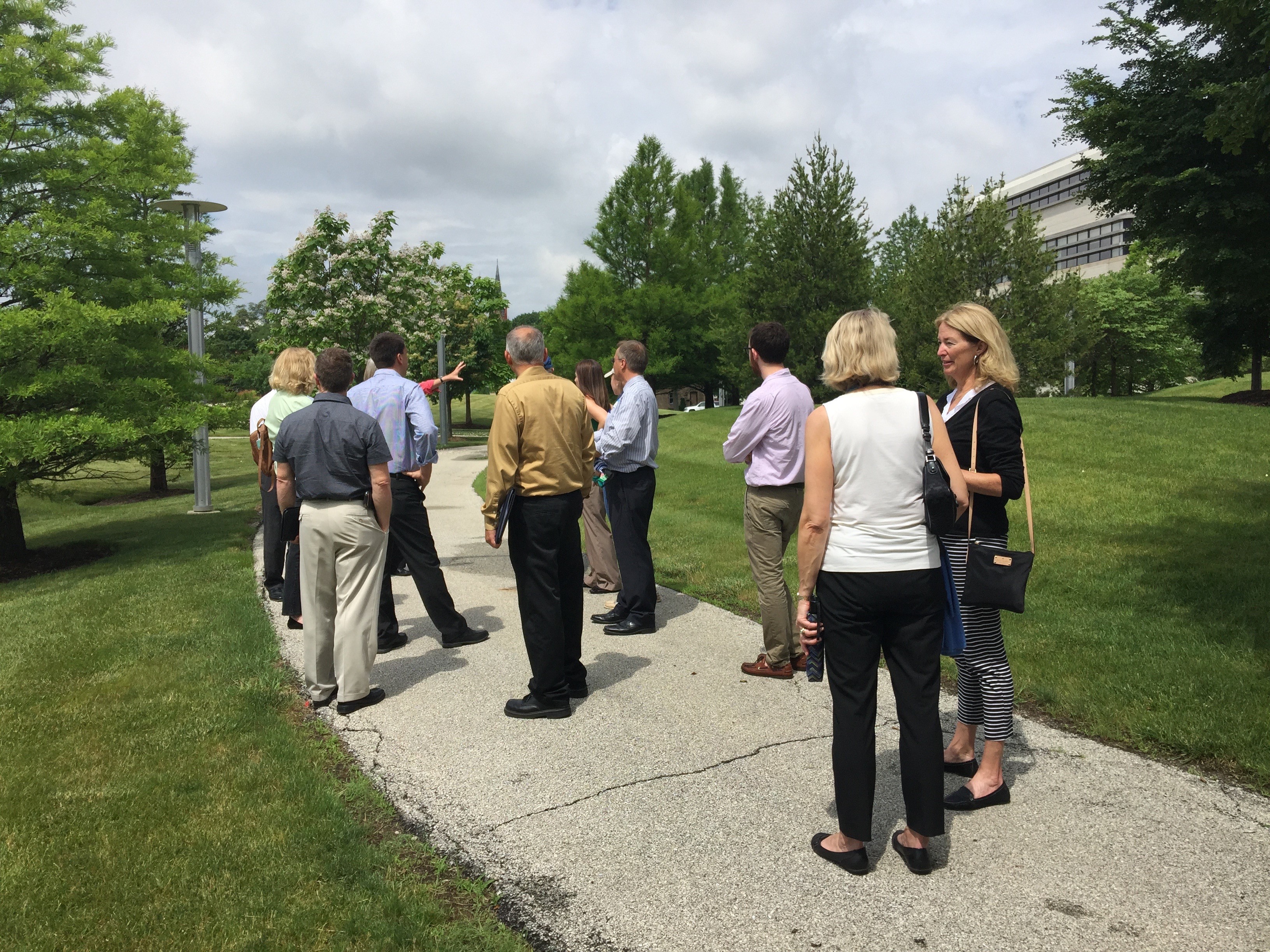 Annual MDRN Summer Mobile Workshop: Glenview, IL (July 14, 2016) - The Chaddick Institute's Municipal Design Review Network (MDRN) hosted its annual "Downtown Walking Tour" this July in Glenview, Illinois. This traditional North Shore suburb has embarked on an ambitious plan to revitalize it's village downtown, including a rebuilt Metra train station, public library, repurposed Dominick's grocery store, and riverwalk along the North Branch of the Chicago River. Tours were led by Glenview planning department staff, and included in-depth analysis and discussion about the redevelopment projects undertaken by the Village.