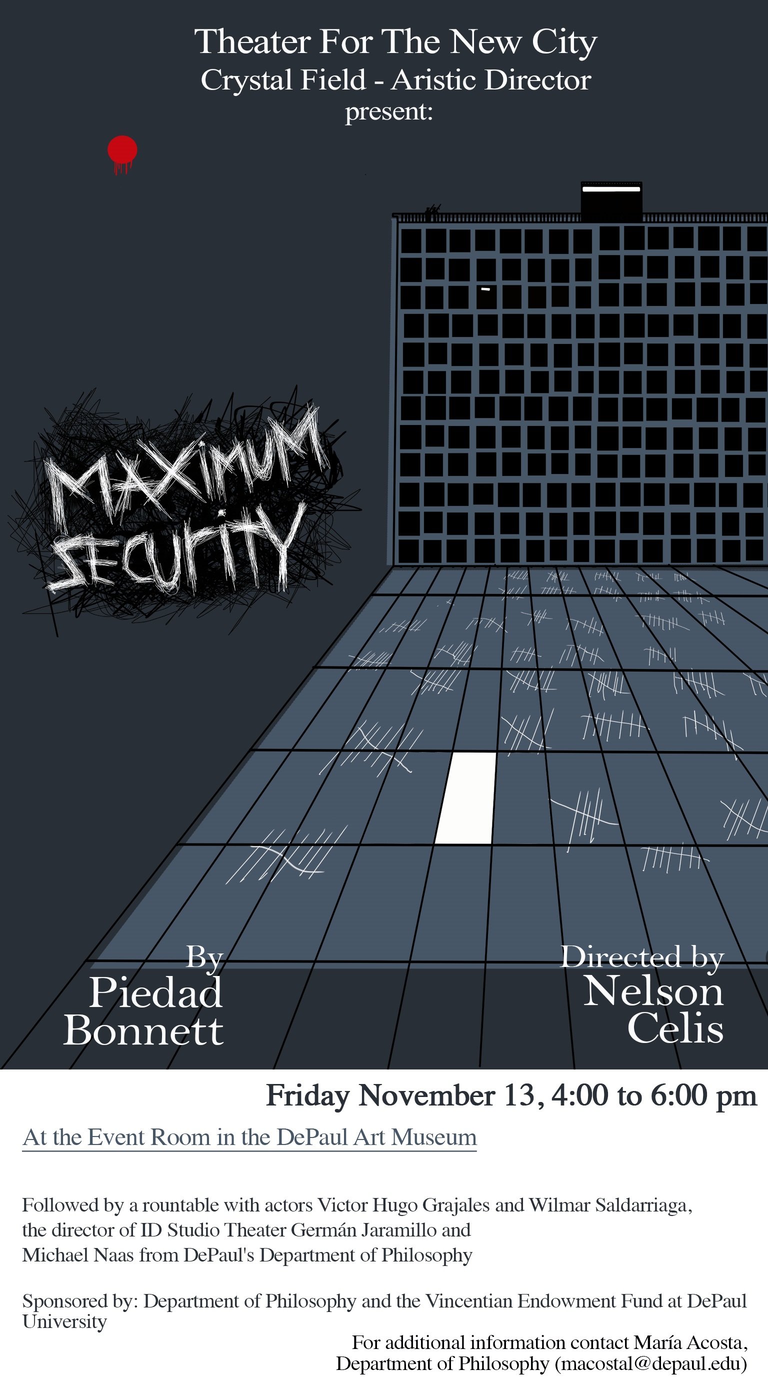 At the Event Room in the DePaul Art Museum: 4:00-5:15 Maximum Security (Theatrical Play) 5:15-6:00 Roundtable